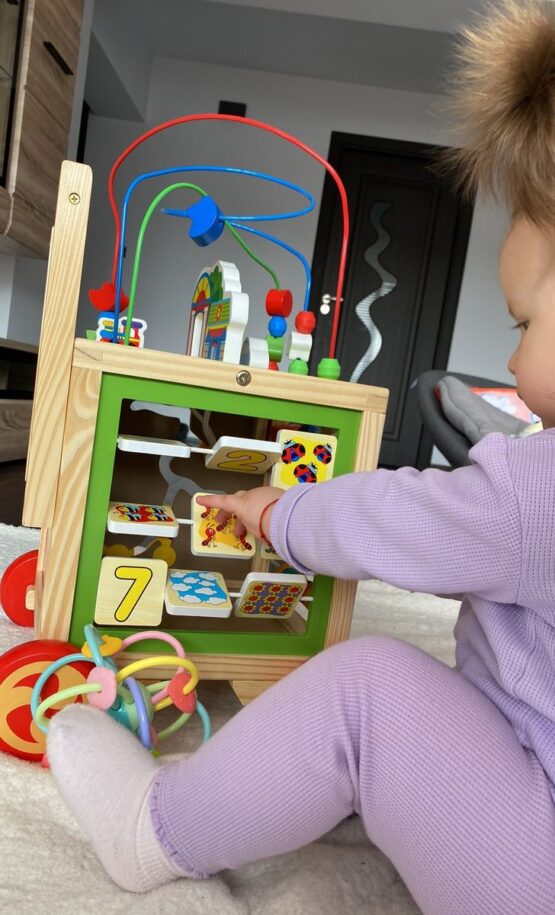 Cub educativ cu activitati, din lemn, cu roti si maner – poate fi folosit si ca jucarie de impins, cub cu 6 functii cu activitati.