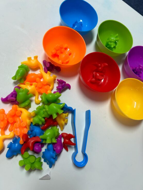 Jocul de clasificat pe culori si numarat „Sortare in cupe Dinozaurii” este o jucarie educativa si distractiva.